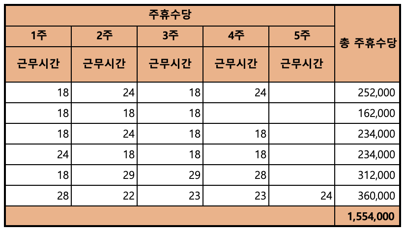 8์๊ฐ๊ณผ ์๊ธ์ ๊ณฑํ ๊ฐ์ 1์ฃผ๊ฐ์ ์ฃผํด์๋น์ผ๋ก ์ ์ฃผ์๊ฒ ์์ฒญํ ์